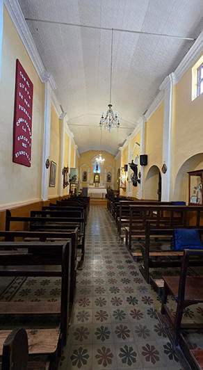 frente se ubica una torrecilla con tres campanas; en el interior existe