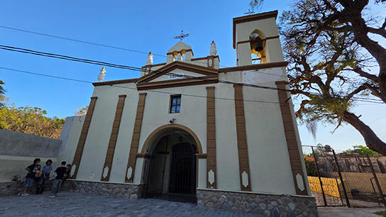 frente se ubica una torrecilla con tres campanas; en el interior existe